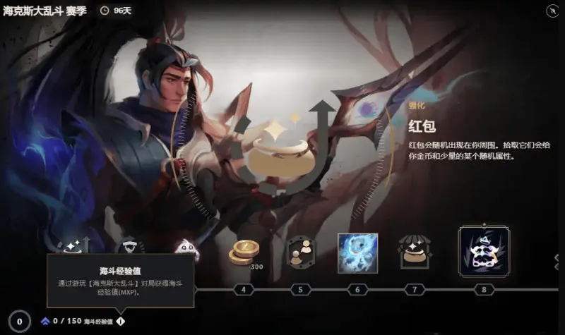 · 红包贺喜:每25-15秒,你的周围将随机刷新红包,拾取后可获得(10-28)~(18-58)金币、4 秒的150点移动速度加成,并随机获得以下一项属性:①5点攻击力+5点法术强度;②5点技能急速;③5点护甲+5点魔抗;④10% 攻击速度;⑤5点移动速度;⑥5点穿甲+5点法穿。