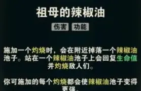 · 祖母的辣椒油:对敌人施加灼烧效果后,将在附近生成一片辣椒油区域,持续5秒。
