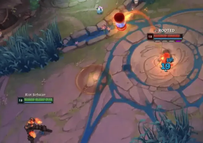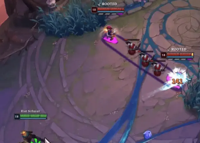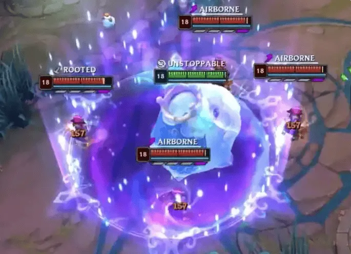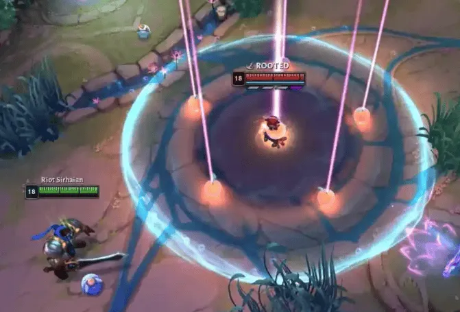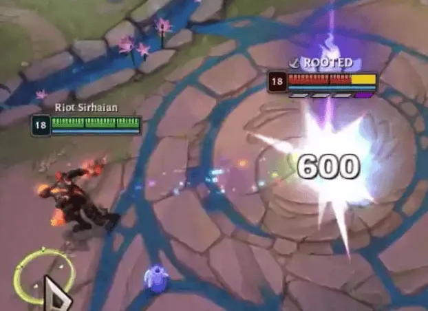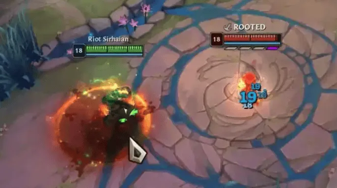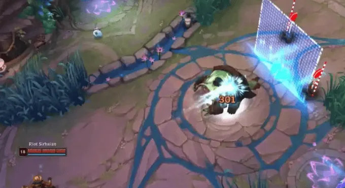 此外,魄罗王每秒会跃向空中并猛砸地面,对附近敌人造成 100-300(+5% 额外生命值)(+100% 基础攻击力)(+50% 法术强度)的物理伤害并将其击退。每次施法,魄罗王无法对同一敌人多次造成击退效果。