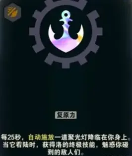· 舞会皇后:每25秒,自动施法一道聚光灯落在自身位置,2.5秒后聚光灯落地,你将获得洛的大招效果,触碰的敌人将被魅惑。